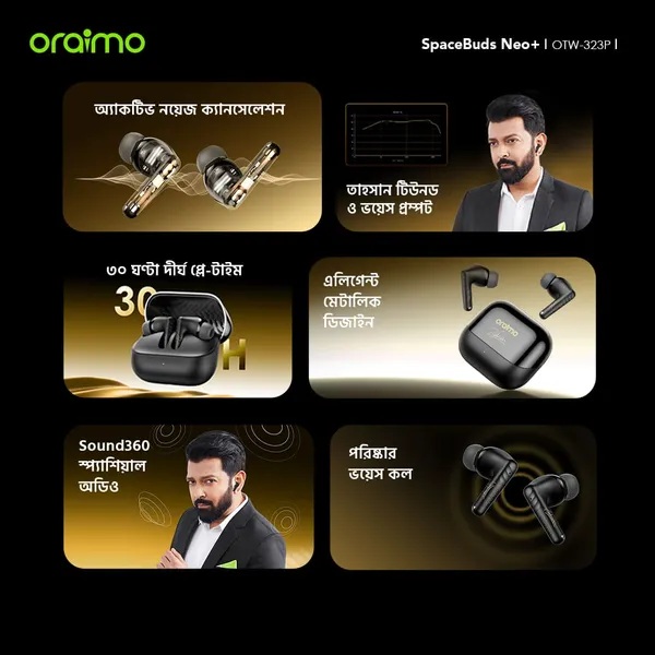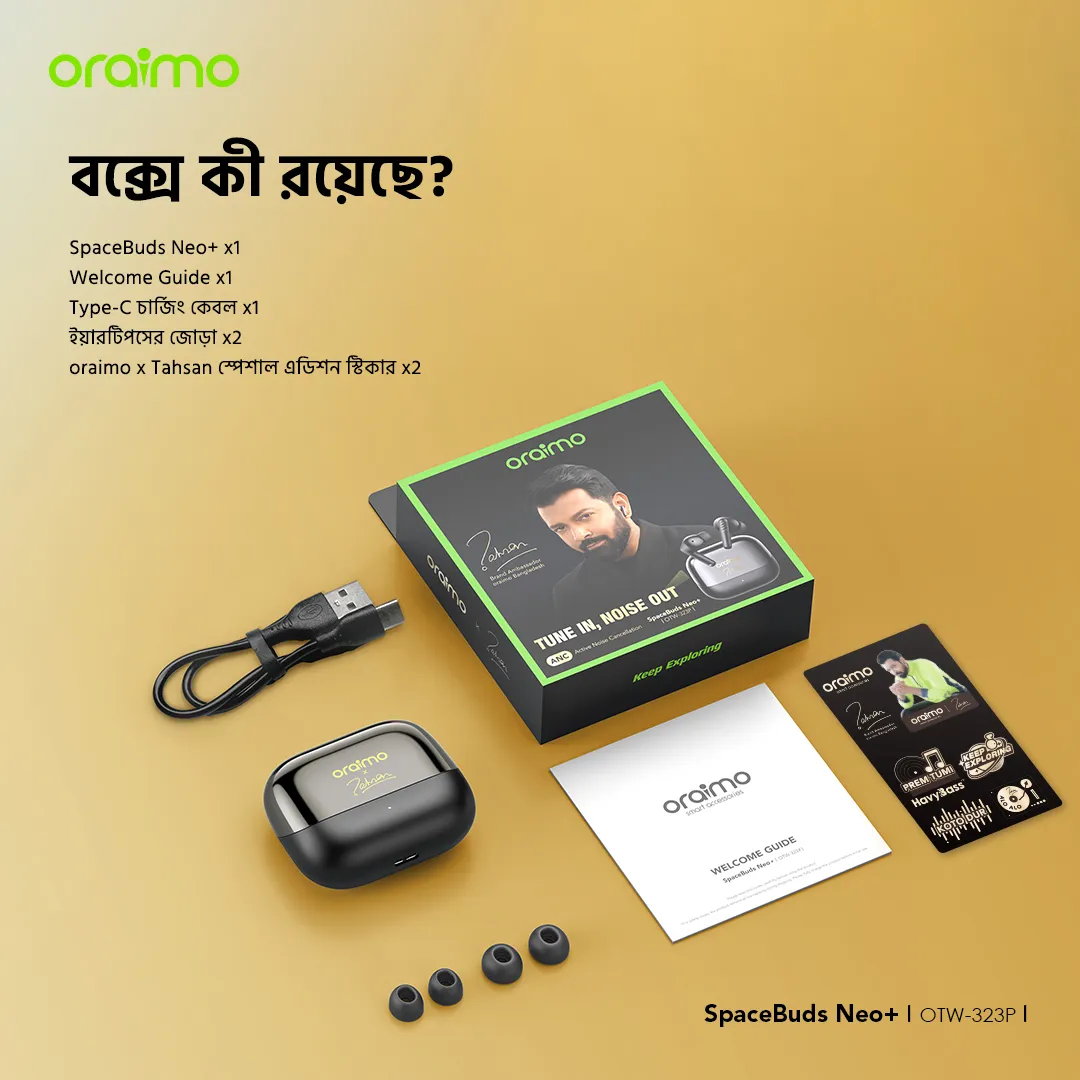 🔥✳️বক্সে কী রয়েছে? 🔥 SpaceBuds Neo+ x1 🔥 Welcome Guide x1 🔥 Type-C চার্জিং কেবল x1 🔥ইয়ারটিপসের জোড়া x2 🔥oraimo x Tahsan স্পেশাল এডিশন স্টিকার x2
