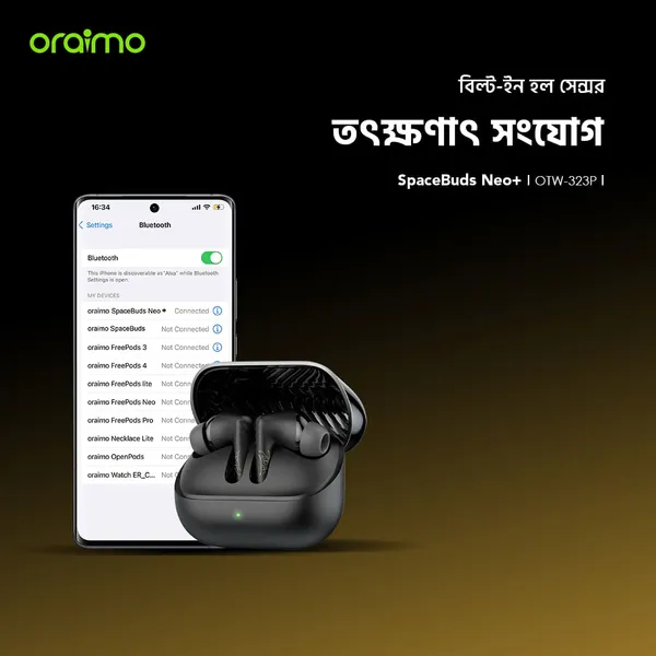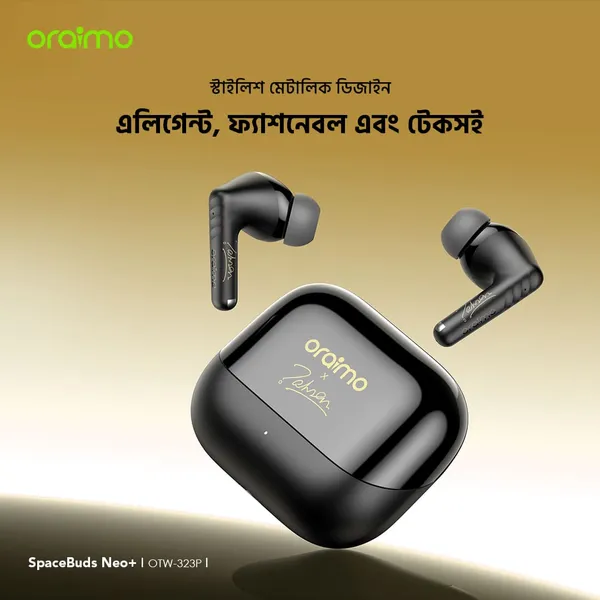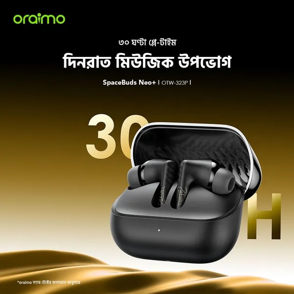 🔋৩০ ঘণ্টার দীর্ঘ প্লে টাইম 📊পুরো চার্জে oraimo SpaceBuds Neo+ ৫ ঘণ্টা প্লে টাইম দেয়, আর চার্জিং কেসে আরও ২৫ ঘণ্টা চার্জ থাকে, তাই একসাথে ৩০ ঘণ্টা গান শুনতে পারবেন।